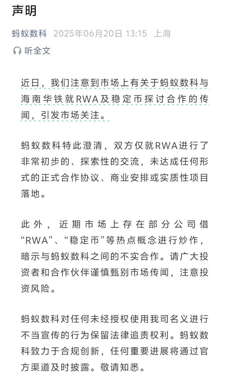 6月20日,蚂蚁数科于午后发布稳定币合作的澄清声明。