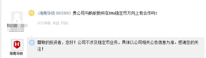 值得一提的是,今日午间有投资者在互动易平台上向海南华铁提问“公司与蚂蚁数科在RWA稳定币方向上有合作吗?”